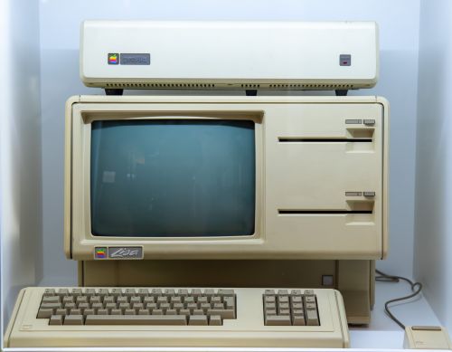 Zwei Schritte nach links um die Ecke führen zum nächsten Erzeugnis, der Lisa von 1983. Der Apple-Fan muss sich bücken, sie belegt eine Kabine im Untergeschoss des Bereichs. Unverkennbar sind die Diskettenschlitze neben dem Monitor, auf dem Computer ruht noch eine Festplatten-Einheit. In ihm steckt der 68000-Prozessor von Motorola mit sechzehn Bit. Mit grafischer Benutzeroberfläche und Mausbedienung war die Lisa höchst innovativ, aber auch ziemlich teuer; bei uns kostete sie 30.000 DM. Apple verkaufte nur 20.000 Stück.
