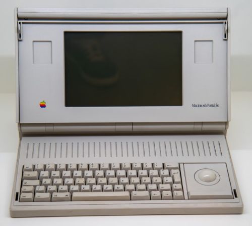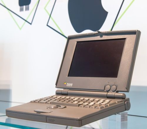 Im HNF verbirgt sich der NeXT in der Internetwand am Schluss der Etage; er steht links von der Mitte. Der nächste Apple in der Chronologie ist der Macintosh Portable von 1989. Auch er entpuppte sich als Misserfolg, die Produktion endete nach zwei Jahren. Der HNF-Kurator platzierte den Computer im Untergeschoss am Ende der PC-Schau. Hoch oben vor der Grafik mit dem Apfel schwebt das PowerBook 100. Das Gemeinschaftswerk von Apple und Sony erschien 1991 und spülte eine Milliarde Dollar in die Kassen der Firma.