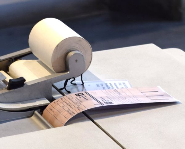 Auf der Oberseite zog der Rechner die Magnetkarten ein; sie kamen ganz vorn in der Mitte wieder heraus. (Foto Piergiovanna Grossi CC BY-SA 4.0 seitlich beschnitten)