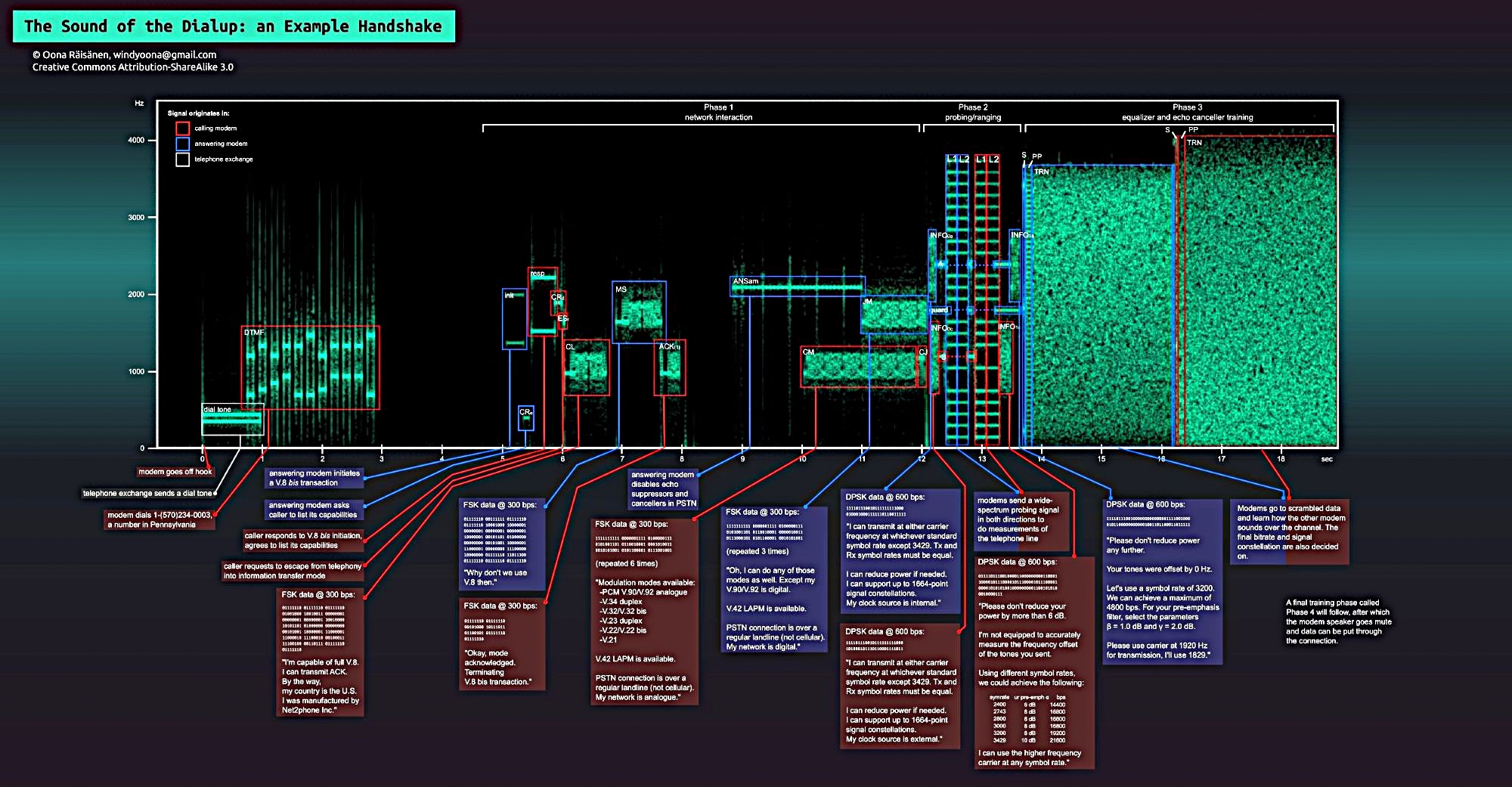 Ein Beispiel bringt dieses YouTube-Video. Wir hören das Anwählen – die Amerikaner sagen Dial-Up – eines Online-Dienstleisters im normalen Tempo und danach etwas verlangsamt. Die Grafik aus dem Video folgt unten (CC BY-SA 3.0), sie stammt aus dem Jahr 2012 und von der finnischen Informatikerin Oona Räisänen. Es ist ein akustisches Spektrogramm. In der x-Achse läuft die Zeit, die y-Koordinate gibt die Frequenz an. Die roten Kästen enthalten die Töne vom Modem des Computers, die blauen erfassen das Gegenstück vom Webdienst.