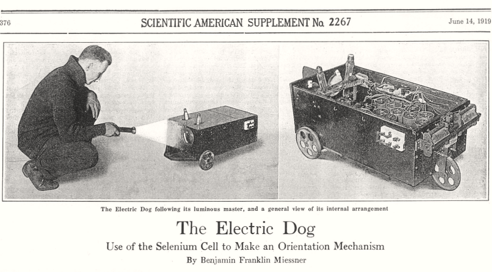 Künstliche Hunde sind keine neuer Erfindung. Den ersten schuf 1912 der junge Ingenieur Benjamin Miessner im US-Bundesstaat Massachusetts. Er hieß Seleno und orientierte sich mit zwei Fotozellen; sie verwendeten Selen-Detektoren, deshalb der Name. Seleno folgte dem Herrchen noch auf Rädern, spätere Modelle stehen in einer Liste des Cyberneticzoo. Eine Bauanleitung auf Deutsch verfasste 1958 der Philips-Mitarbeiter A. H. Bruinsma; sein Roboterhund bewegte sich auf vier Beinen. Ab 1999 lieferte Sony den putzigen Aibo aus.