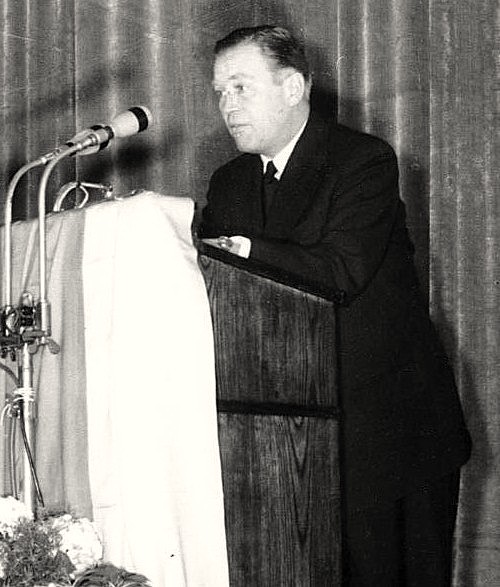 Otto John am 11. August 1954 auf seiner Pressekonferenz in Ost-Berlin (Foto Bundesarchiv, Bild 183-25876-0001 / Heilig, Walter / CC BY-SA 3.0 seitlich beschnitten)