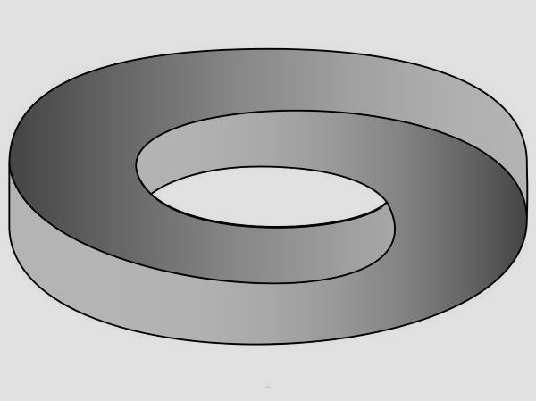 Was macht eine Figur unmöglich? In der Regel ist es eine falsche Verbindung. In unserem Eingangsbild – es folgt einem Reutersvärd-Entwurf – verläuft ein hochkant stehender Ring durch ein horizontales Brett. Die Schnittstellen passen nicht zur Orientierung, es dürfte nur eine Kreuzung geben. Der Zeichenstift erschafft zwei. Das Grundprinzip erklärt auch eine Animation. Bei den Reutersvärd-Würfeln weisen die Enden der Reihe, wenn man irgendwo einen Würfel wegnimmt, in verschiedene Richtungen. Der Künstler schließt sie kurz.
