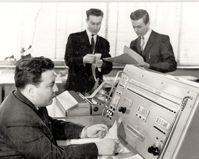 Klaus Apitzsch 1963 am Computer ZRA 1 – 1973 landete er in einem Monumentalgemälde. (Foto Heinz Koch, Bundesarchiv, Bild 183-B0314-0091-002 CC-BY-SA 3.0)