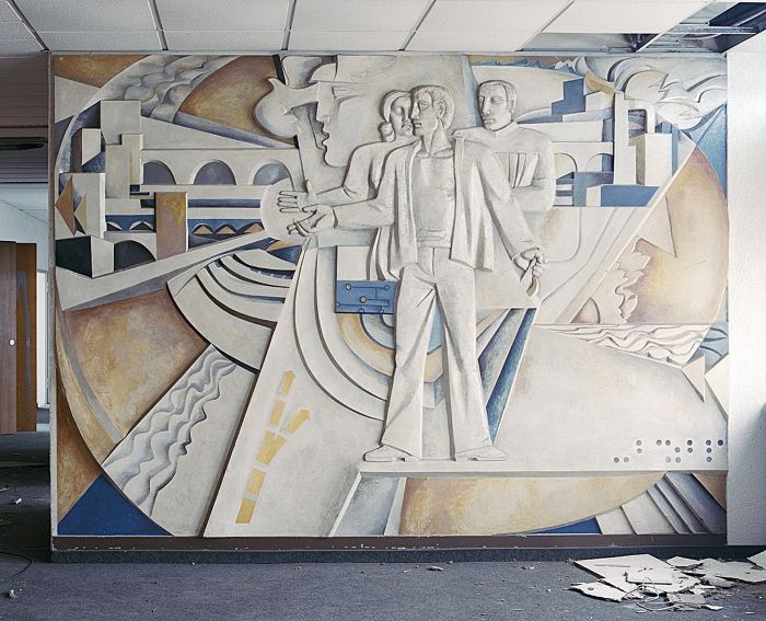 Der Bildhauer Klaus Schwabe schuf 1970 ein Relief für das Robotron-Haus in Leipzig, das Margret Hoppe 2012 aufnahm (Foto HMKV, Ausschnitt). Man beachte die Lochungen rechts.