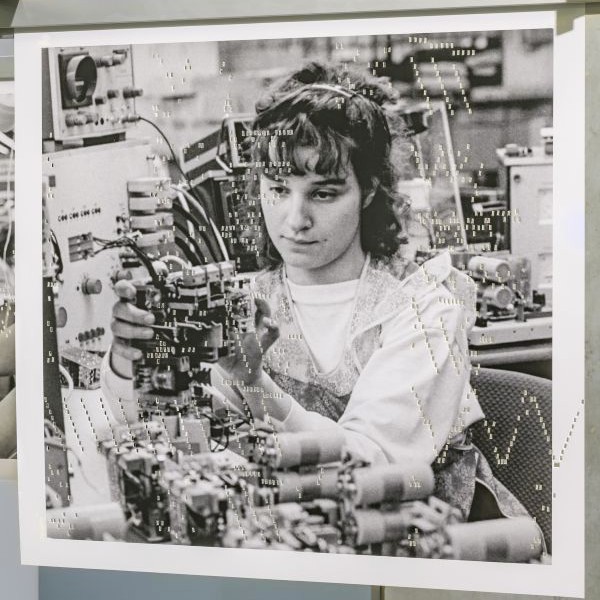 Irma Markulin versah historische Fotos von Robotron-Arbeiterinnen mit Mustern, die an perforierte Lochkarten erinnern (Foto HMKV, Ausschnitt).