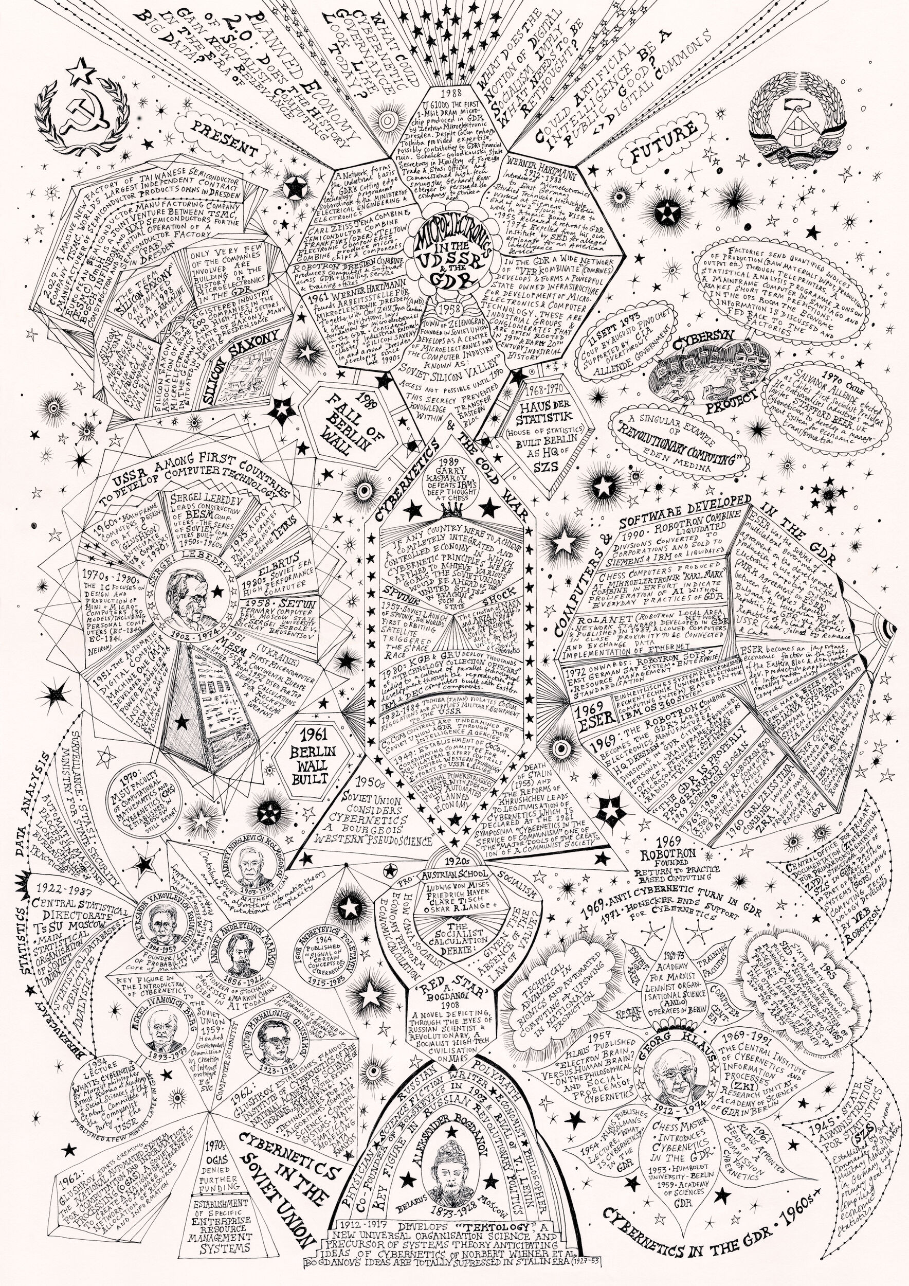 Man kann in Dortmund also Entdeckungen machen wie die Gittersee-Affäre. Am Rand von Dresden wurde im November 1989 der Bau einer Siliziumfabrik gestoppt – sechs Tage vor dem Fall der Berliner Mauer. Kaum bekannt waren im Westen auch die geometrische Kunst von Karl-Heinz Adler und die Schreibmaschinen-Bilder von Ruth Rolf-Rehfeldt. Der IT-Historiker bestaunt die zeichnerische Darstellung der Ostblock-Kybernetik durch die Engländerin Suzanne Treister. Vom Computer erzeugte Grafiken kamen in der DDR von Horst Bartnig, die Arbeiten von Horst Völz fehlen leider in Dortmund.