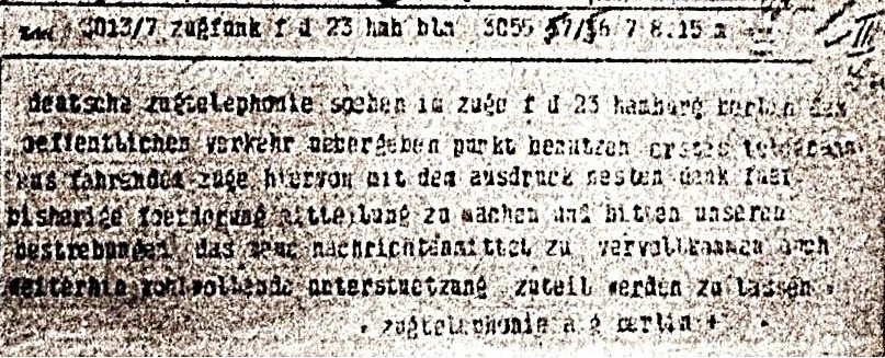 „deutsche zugtelephonie soeben im zuge f d 23 hamburg berlin dem oeffentlichen verkehr uebergeben punkt benutzen erstes telegramm aus fahrendem zuge hiervon mit dem ausdruck besten dank fuer bisherige foerderung mitteilung zu machen und bitten unseren bestrebungen das neue nachrichtenmittel zu vervollkomnen auch weiterhin wohlwollende unterstuetzung zuteil werden zu lassen zugtelephonie a g berlin“